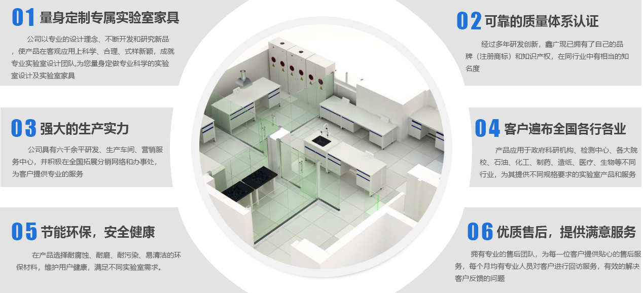 山東鑫廣實驗設備科技有限公司成立于2007年,是一家位于山東濰坊的實驗室家具工廠。作為實驗室整體解決方案服務商,我們提供從實驗室規劃、實驗室設計、實驗室裝修、實驗室工程、實驗室家具、實驗室設備、到實驗室服務等實驗室建造一站式服務,致力于專業研發、設計、生產實驗室家具等產品及相關配套設備,并提供實驗室建設全套解決方案的新型高科技企業。公司下設研發加工工廠、營銷服務中心,并積極在全國拓展分銷網絡和辦事處,為客戶提供更專業、優良的產品和服務。